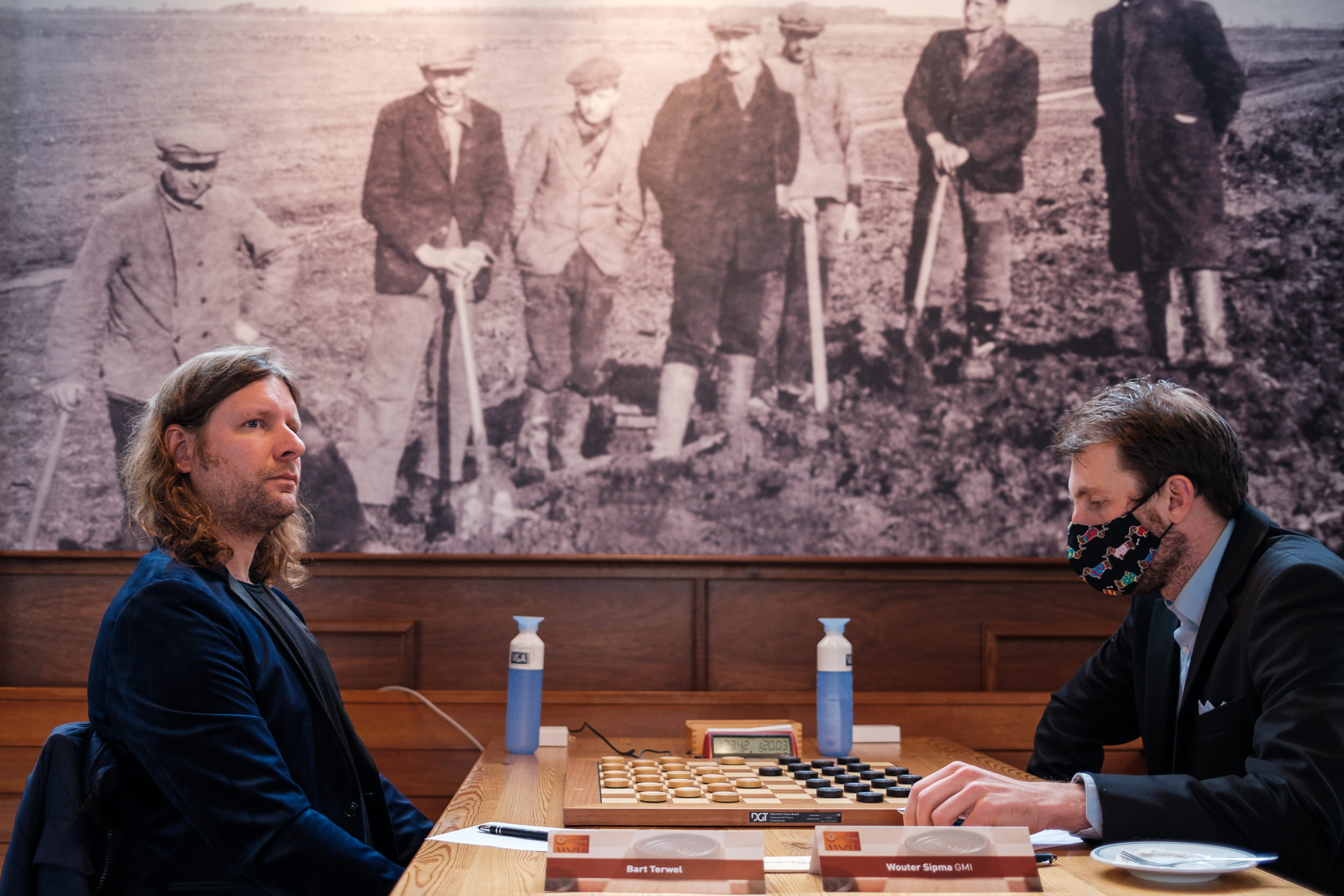 Tjon A Ong-Grotenhuis ten Harkel; twee oudgedienden (respectievelijk 58 en 61 jaar) die debuteren op dit NK. Tjon A Ong bouwde telkenmale keurige centrumstellingen op, die door zijn tegenstrever evenzovele malen werden afgebroken. Niet dat Grotenhuis ten Harkel alles eraf hakte, maar voor een eenvoudige damvolger vlogen de vonken er niet af. Aan de éne kant jammer natuurlijk, maar ook wel weer begrijpelijk; niets is zo erg als verliezen in de eerste ronde van je debuut; 1-1.