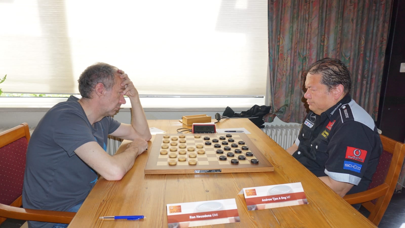Uit eerbied en respect voor zijn vader damt Andrew het toernooi dus uit; dat betekende dat hij vandaag moest aantreden tegen Ron Heusdens. Na een zogenaamde Keller-opening kwam Andrew mooi in de aanval te staan; een changement op de 27ste zet bezorgde Andrew een schijf midden op het bord. Ron probeerde daar iets aan te doen, maar al snel bleek de remise de enige optie;